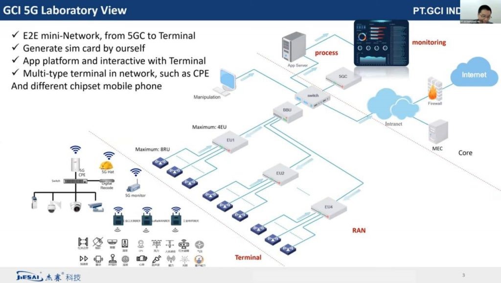 This is GCI laboratory the network architecture that GCI already set up end-to-end mini network include core network, access network, and the terminals. It seems like a mini operator that we can generate a sim card by ourself define the user quality such as golden user, silver user, and bronze user. GCI set up the application server and interactive with terminal such as get temperature and noise, collect the video from the camera besides already tried different type of terminal to access the network since the compatible with terminal is very important.