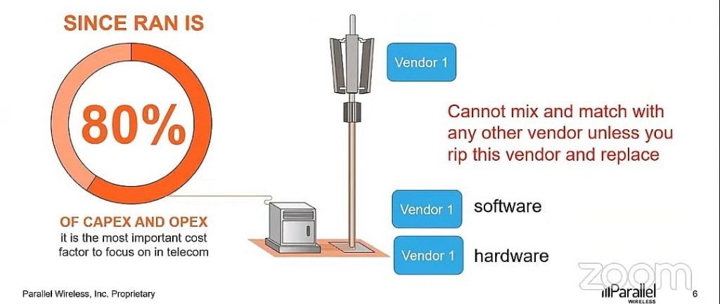 80% of CAPEX and OPEX mobile operators spend on ran is very expensive, and because of consolidation in the market what is been happening is mobile operators were not able to mix and match. So the radio on top came from the same vendor as the BBU on the bottom, and the software from the same vendor was on that BBU. Because it is cannot mix and match components with any other vendor because the prices is will went up, and TCO(total cost of ownership) is also went up. When TCO is goes up mobile operators can not afford to bring coverage to everyone and everywhere. Unless we rip this vendor and replace.