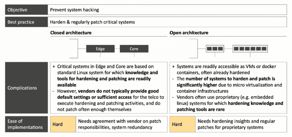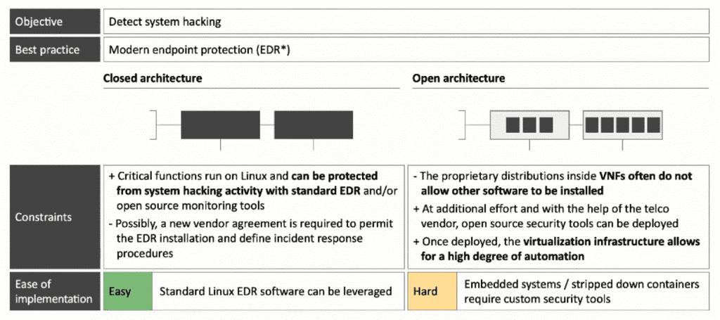 Modern endpoint protection can be deployed easily on standard Linux, but not on many VNFs in open network architectures. The objective is to detect system hacking and the best practice for this is a modern endpoint protection (Endpoint Detection and Response or EDR). For closed architecture relatively easy to solve but for open architecture is relatively hard to solve. The table below the differentiations between Closed Architecture and Open Architecture based on the complications and the ease of implementation.