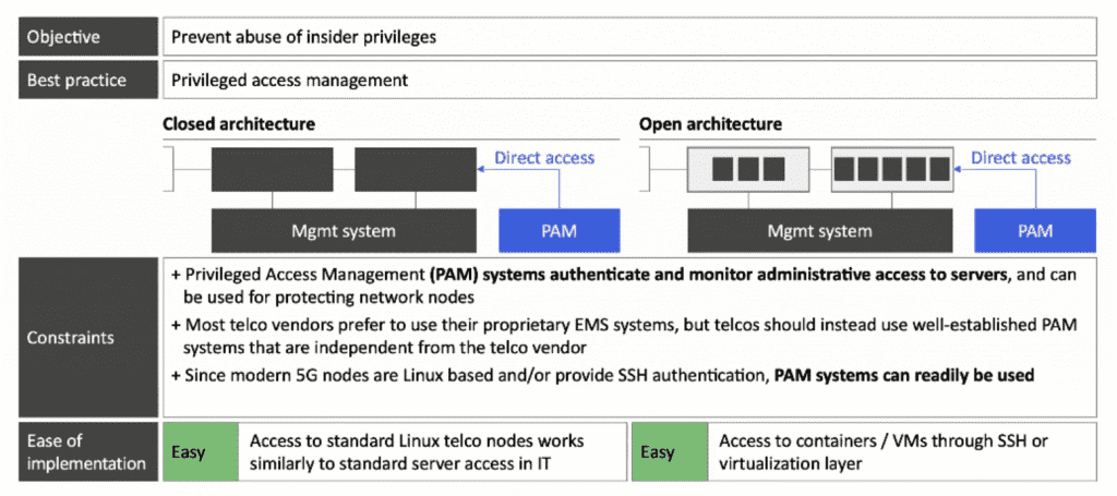Standard PAM system can protect core network nodes from rogue/hacked insiders. The objective is to prevent abuse of insider privileges and the best practice for this is privileged access management. Both architectures are relatively easy to solve. The closed architecture needs access to standard Linux Telco nodes that works similarly to standard server access in IT while the open architecture needs access to containers/VMs through SSH or the virtualization layer.