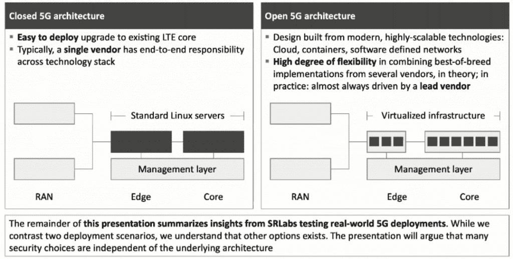 This presentation summarizes insights from SRLabs testing real-world 5G Deployments. SRLabs contrast 2 deployment scenarios, and they understand that other options exist. There are many security choices that are independent of the underlying architecture. The difference between Closed 5G architecture and Open 5G architecture.